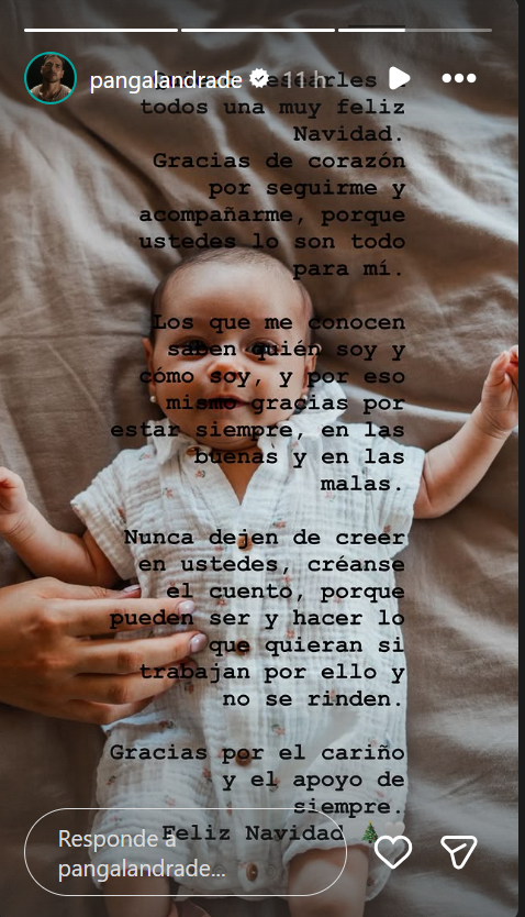 Andrade finalizó indicando: "Nunca dejen de creer en ustedes, créanse el cuento, porque pueden ser y hacer lo que quieran si trabajan por ello y no se rinden. Gracias por el cariño y el apoyo siempre. Feliz navidad".