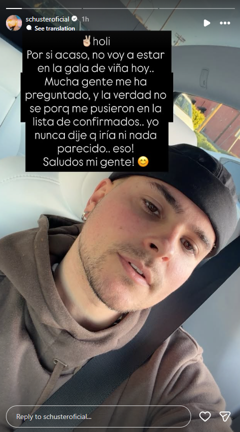 A través de su cuenta de Instagram, Augusto Schuster anunció en último momento que no desfilará en la alfombra roja de Viña del Mar.