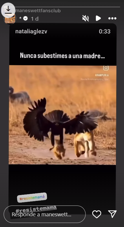 En esta ocasión, Swett compartió una publicación de la activista Natalia González, que menciona: "Nunca subestimes a una madre", y en el video aparece un águila intentando cazar al cachorro de una leona.