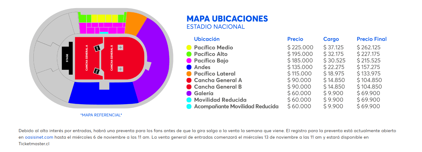 Además, se informó que la venta de entradas para ver a Oasis en Chile será este MIÉRCOLES 13 DE NOVIEMBRE, a las 11:00 horas a través de Ticketmaster.