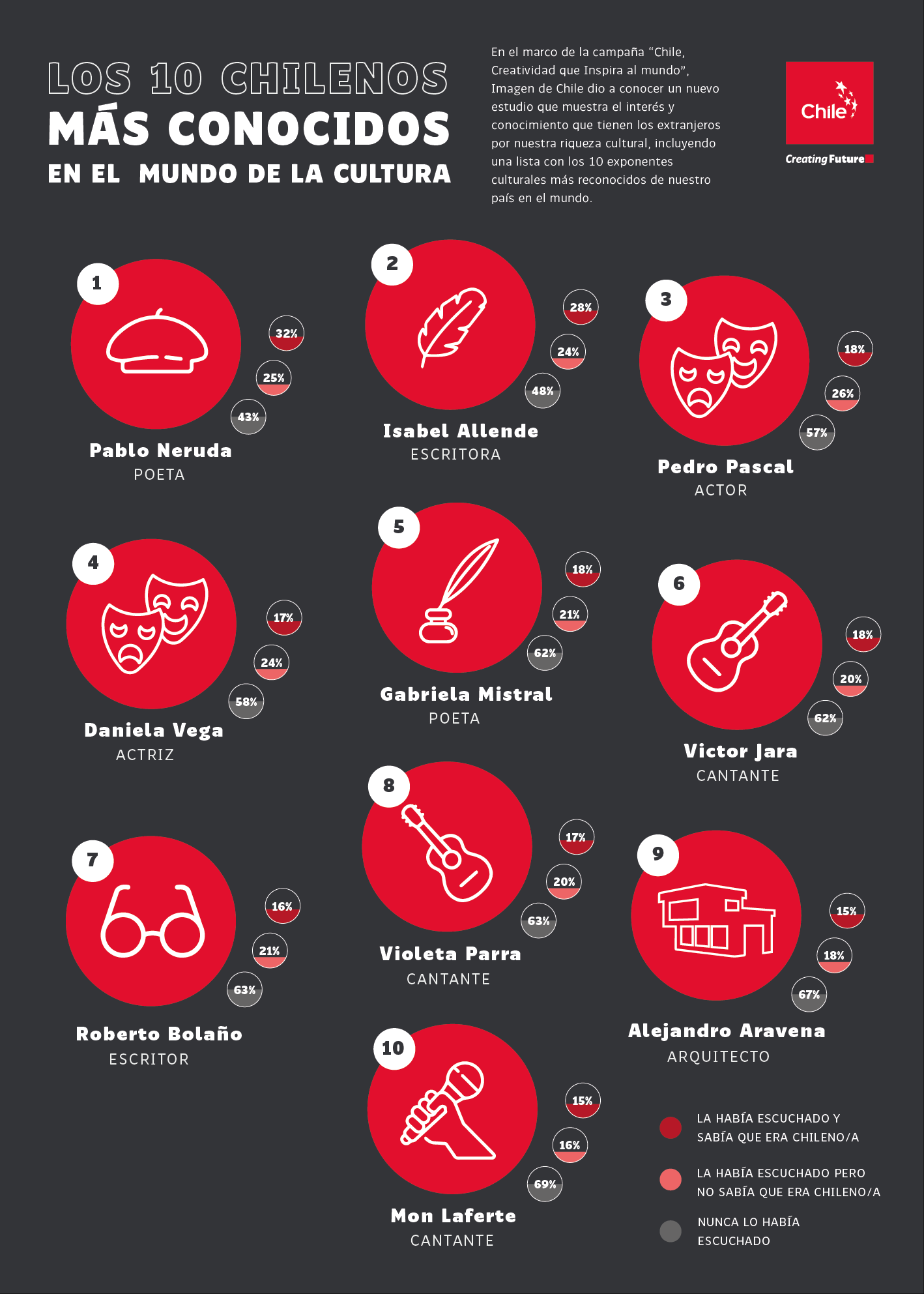 En esta ocasión, al tratar la temática cultural y patrimonial, se consultó a los encuestados qué artistas nacionales conocían, y si sabían de su origen chileno. Entre los 10 más mencionados hay figuras de la literatura, teatro, música y arquitectura. De esta forma, el top 10 quedó conformado por los siguientes exponentes: