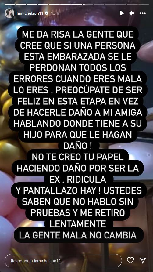 preocúpate de ser feliz en esta etapa en vez de hacerle daño a mi amiga, hablando donde tiene a su hijo para que le hagan daño", continuó.