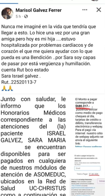 estuvo hospitalizada por problemas cardíacos y de corazón, el que me quiera ayudar con lo que pueda es una bendición. Por Sara soy capaz de pasar por esta vergüenza y humillación".