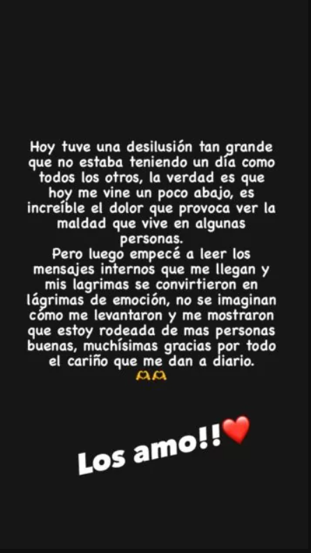 "Hoy tuve una desilusión tan grande que no estaba viviendo un día como todos los otros. La verdad es que hoy me vine un poco abajo. Es increíble el dolor que provoca ver la maldad que vive en algunas personas", señaló la relacionista pública en su cuenta de