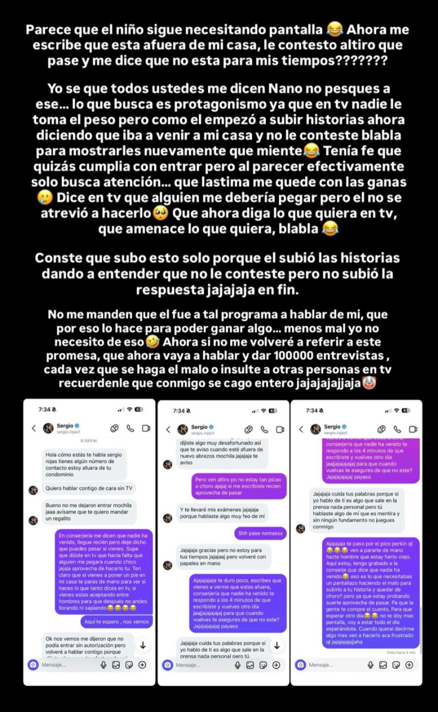 "¿Tienes algún número de contacto? Estoy afuera de tu condominio. Quiero hablar contigo de cara sin TV", escribió Rojas, mientras que Nano contestó: "Dejé dicho que puedes pasar si vienes. Supe que dijiste en TV que hacía falta que alguien me pegara cuando chico".
