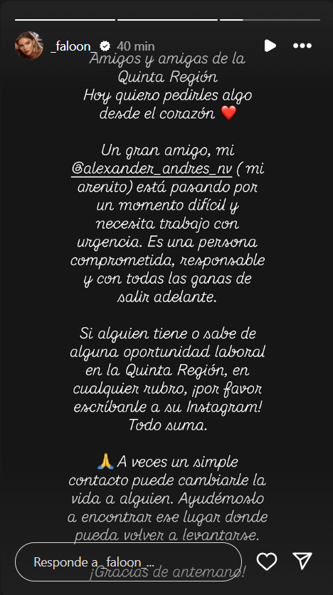 Luego, lo describió como "una persona comprometida, responsable y con todas las ganas de salir adelante". Por lo mismo, escribió, "si alguien tiene o sabe de alguna oportunidad laboral en la quinta región, en cualquier rubro, por favor escríbanle a su Instagram".