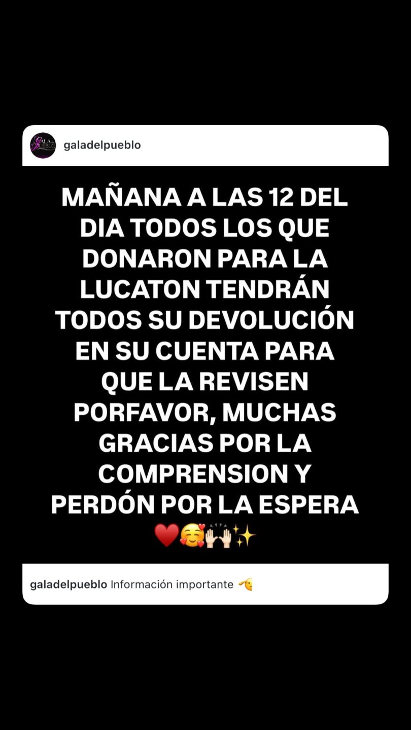 A través de su cuenta de Instagram, Naya comentó: "Mañana a las 12 del día, todos los que donaron para la lucatón tendrán su devolución, para que lo revisen".
