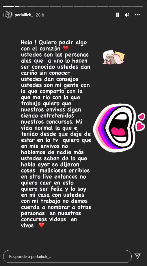 Perla Ilich acudió a sus redes sociales para pedirle a sus seguidores no "nombrar a otras personas" en sus transmisiones en vivo.