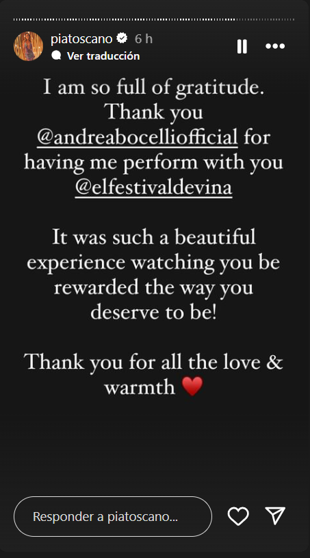 "Gracias Andrea Bocelli por darme la oportunidad de cantar contigo en el Festival de Viña del Mar", escribió en su cuenta, donde suma más de 290 mil seguidores. "Fue una experiencia maravillosa verlos a ustedes recompensados de la manera que se merecen. Gracias por el amor y el calor en el escenario", cerró la ex American Idol.
