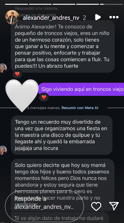 "Ánimo Alexander! Te conozco de pequeño, de Troncos Viejos. Eres un niño de un hermoso corazón, solo tienes que ganar a tu mente y comenzar a pensar positivo, enfocarte y trabajar para que las cosas comiencen a fluir", le escribió la mujer.