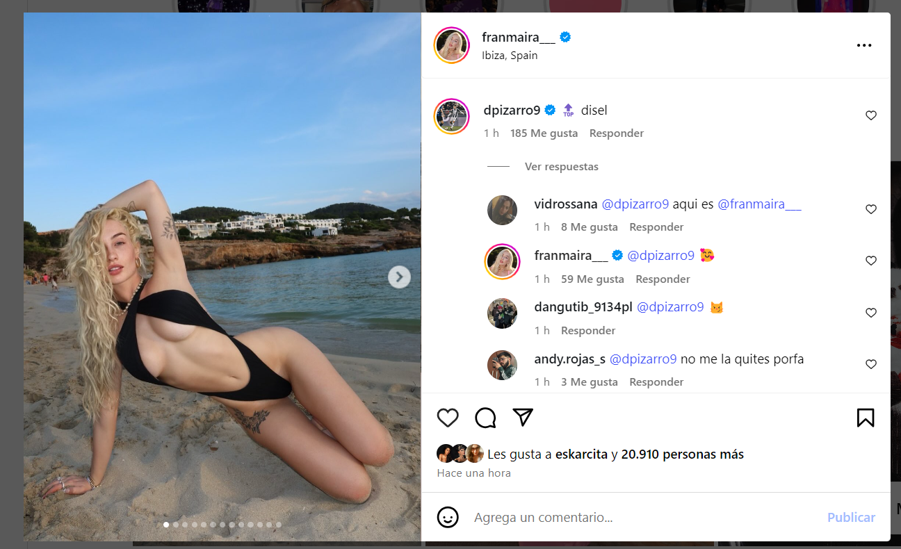 Rápidamente la foto fue comentada por Damián Pizarro, quien escribió "disel", recibiendo de vuelta un emoji con corazones por parte de la artista.