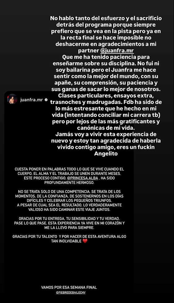 Junto a lo anterior, Princesa Alba agregó: "Me ha tenido paciencia para enseñarme sobre su disciplina. No fui ni soy bailarina, pero el Juanfra me hace sentir como la mejor del mundo, con su apañe, su comprensión, su paciencia y sus ganas de sacar lo mejor de nosotros".
