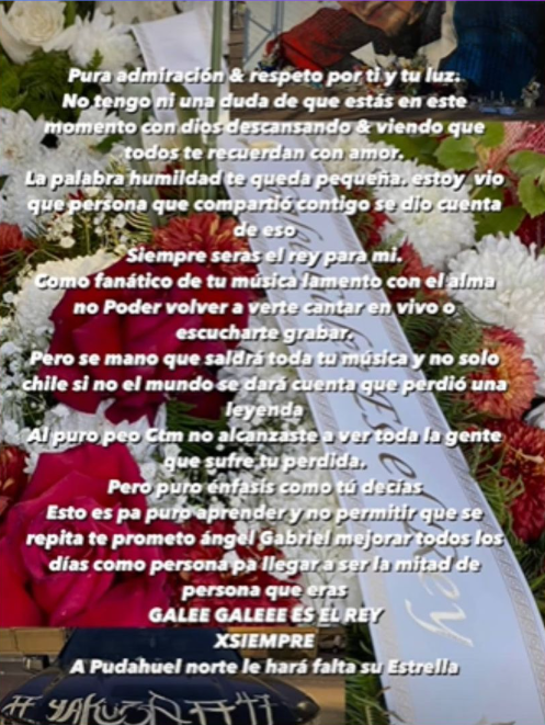 "Te prometo ángel Gabriel mejorar todos los días como persona, para llegar a ser la mitad de persona que eras. Galee Galee es el rey por siempre. A Pudahuel norte le hará falta su estrella", cerró el joven.