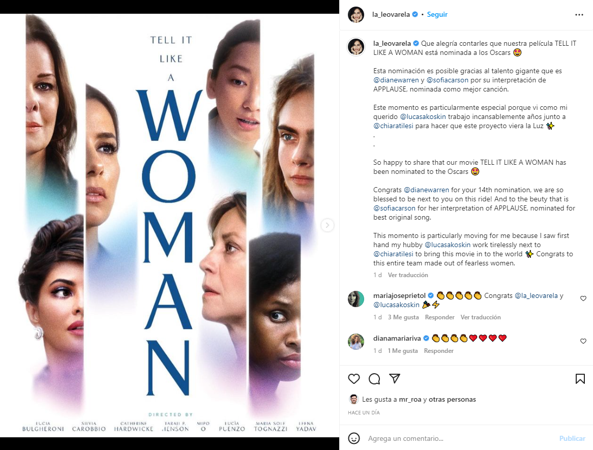 La película Tell It Like A a Woman, donde Leonor Varela interpreta al personaje de Tala, está nominada en la categoría Mejor Canción Original. Se trata del sencillo Applause, el cual es interpretado por la actriz y cantante Sofía Carson, mientras que la letra fue escrita por la destacada compositora Diane Warren. Así, la destacada intérprete chilena destacó el logro de sus compañeros y compañeras por la nominación. A su vez, también tuvo palabras para su marido, quien fue productor del filme. “Este momento es particularmente especial porque vi cómo mi querido Lucas Akoskin, trabajó incansablemente durante años junto a Chiara Tilesi para hacer que este proyecto viera la luz”, sentenció en la publicación.