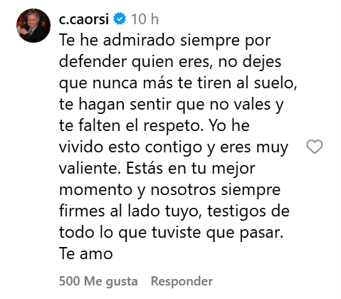 A través de su cuenta de Instagram, Caorsi señaló: "Te he admirado siempre por defender quién eres, no dejes que nunca más te tiren al suelo, te hagan sentir que no vales y te falten el respeto".