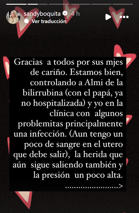 recién nacida se encuentra de alta y junto a su padre, mientras que ella permanece hospitalizada "con algunos problemitas".