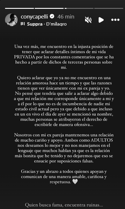 “Quiero aclarar que yo ya no me encuentro en una relación amorosa hace un tiempo y que las razones tiene que ver únicamente con mi ex pareja y yo”, inició comentando en un extenso mensaje.