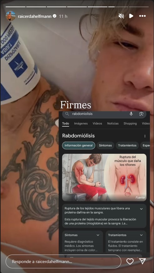 Junto con el mensaje “Firmes”, el joven añadió una captura de pantalla con el diagnóstico de su condición: rabdomiólisis.