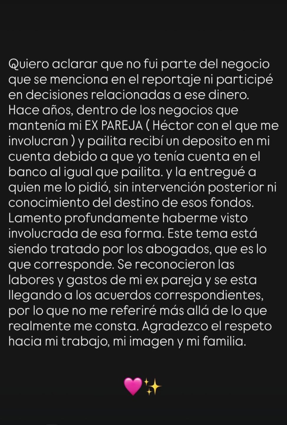 En esa misma línea, agregó: "Hace años, dentro de los negocios que mantenía mi expareja, Héctor, con el que me involucran, y Pailita, recibí un depósito en mi cuenta debido a que yo mantenía una cuenta en el banco, al igual que Pailita".
