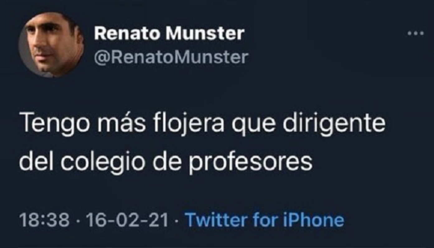@RenatoMunster te hablan. Por qué trataste de flojos a dirigentes y profesores y luego borraste ? https://t.co/6Lw3wkkIMN— Pedro Peter Quezada (@pedroqosorno) February 17, 2021