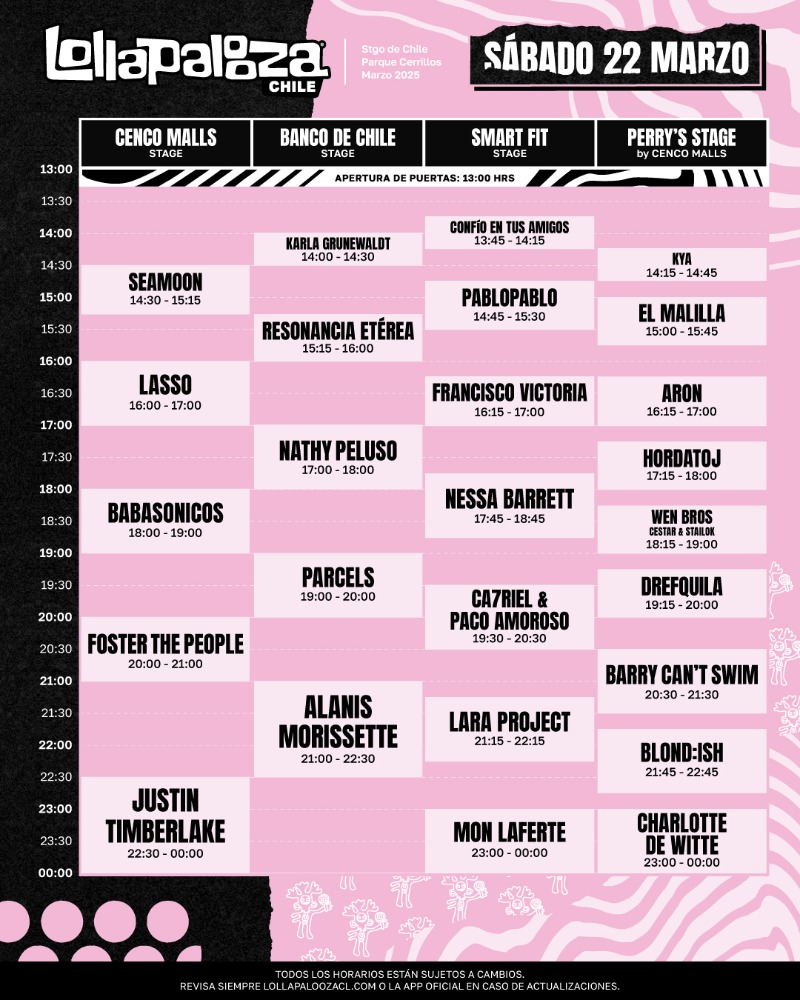 Lollapalooza Chile reveló este martes los horarios para su lineup de su versión 2025, festival que se llevará a cabo el 21, 22 y 23 de marzo en el Parque Cerrillos.