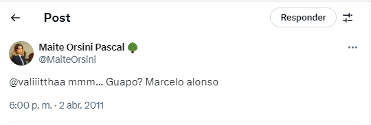 Además, un tuit de Maite, de abril del 2011, también ha vuelto a circular, por la misma razón. "¿Guapo? Marcelo Alonso", se lee en dicha publicación.