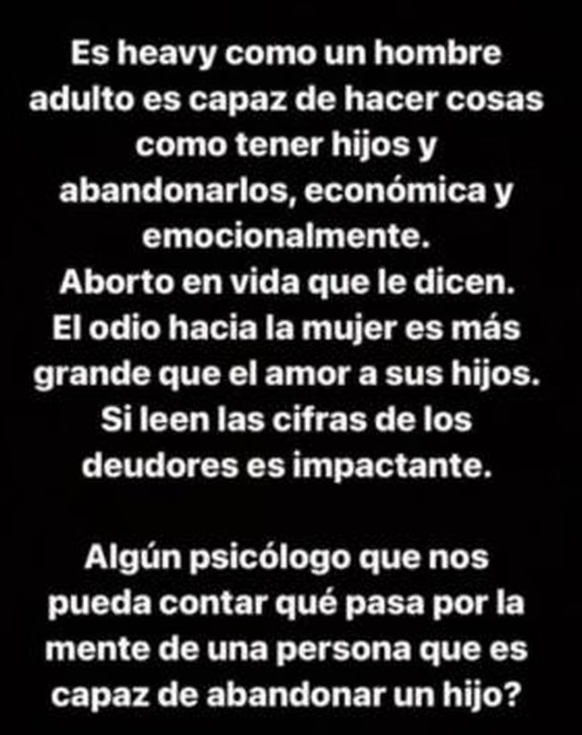 La actriz utilizó las redes sociales para referirse nuevamente a esta situación, acusando que el padre de sus mellizos "jamás se ha interesado en regularizar" sus obligaciones. "El odio hacia la mujer es más grande que el amor a sus hijos", reflexionó.