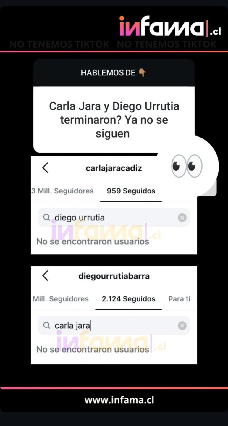 Durante la noche de este viernes, un usuario en redes sociales reportó la situación al portal Infama y señaló: "¿Carla Jara y Diego Urrutia terminaron? Ya no se siguen".