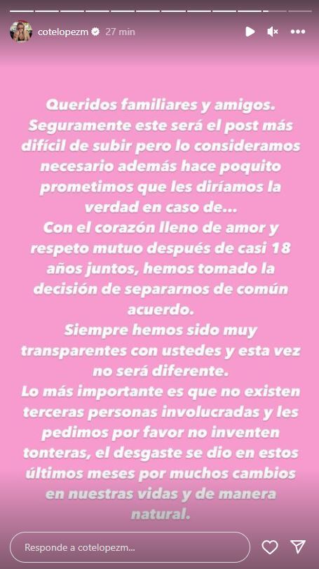después de casi 18 años juntos, hemos tomado la decisión de separarnos de común acuerdo. Siempre hemos sido muy transparentes con ustedes y esta vez no será diferente", agregó.