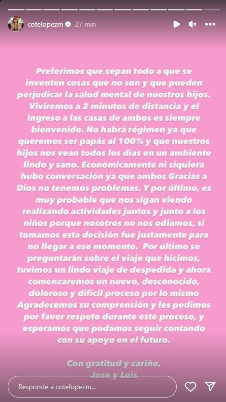 El hecho se dio a conoce durante este viernes a través de las historias de Instagram de la influencer. La pareja decidió sincerar lo que está ocurriendo entre ellos para evitar tergiversaciones en los medios.