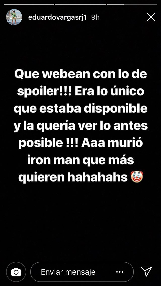 Lee también: 5 datos que debes saber antes de ver Avengers: Endgame, la cinta que cierra la sagaA modo de venganza, el goleador de La Roja fue mucho más lejos, escribiendo “Que webean con lo de spoiler. Era lo único que estaba disponible y la quería ver lo antes posible. Aaah muró Iron Man qué más quieren”.