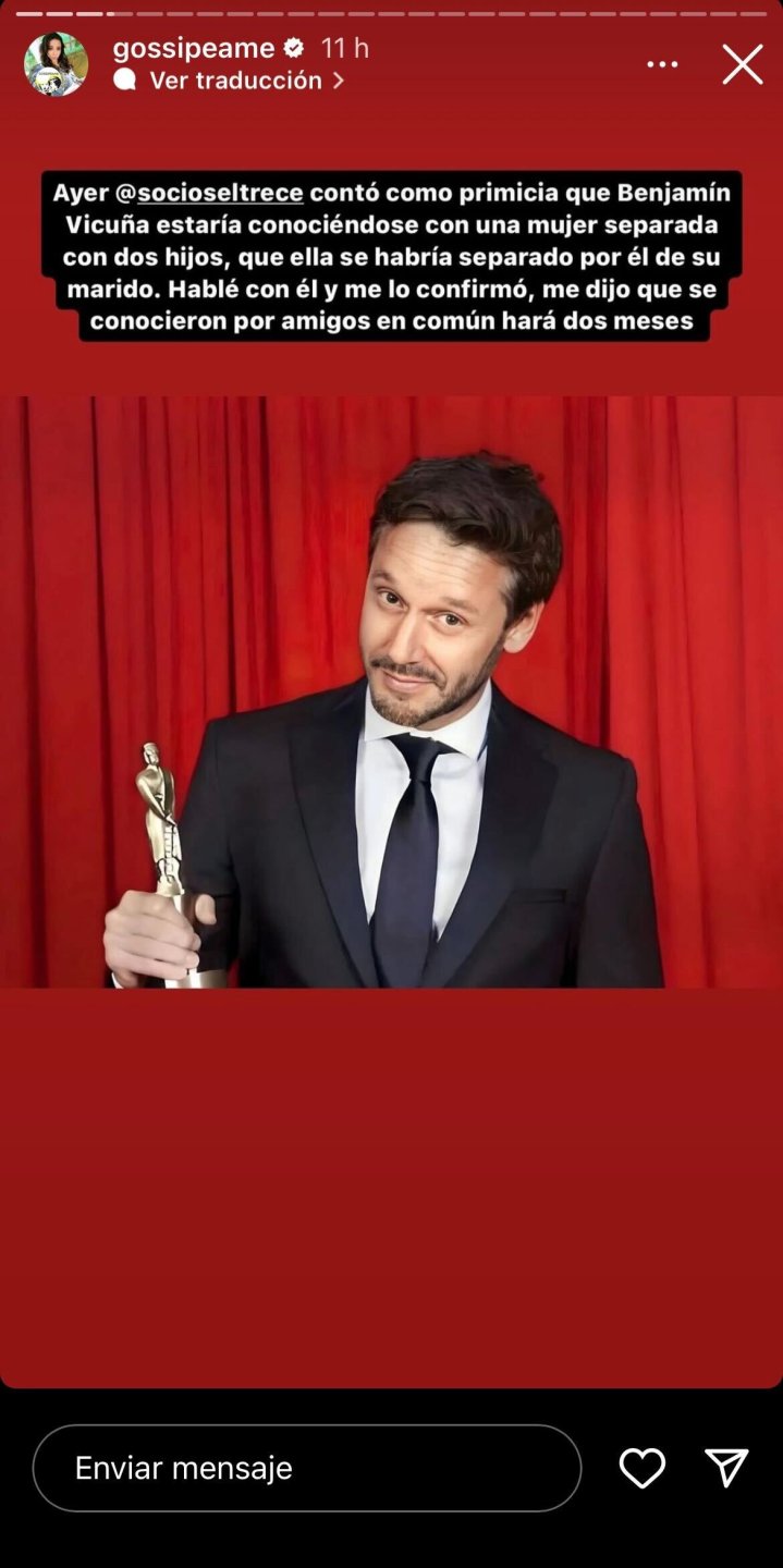 “Ayer @socioseltrece contó como primicia que Benjamín Vicuña estaría conociéndose con una mujer separada con dos hijos, que ella se habría separado por él de su marido. Hablé con él y me lo confirmó, me dijo que se conocieron por amigos en común hará dos meses ”, expresaba el escrito.