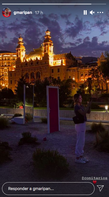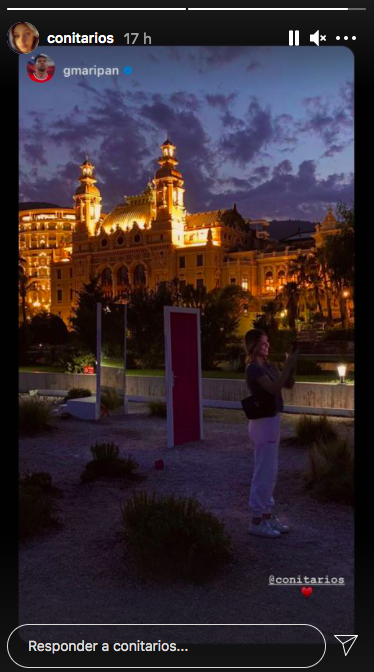 En la foto, se ve a Coni Ríos, quien viste un pantalón blanco, en medio de un paisaje al atardecer, con el casino de Montecarlo de fondo. Además, en la storie aparece su nombre de usuario junto a un emoji de corazón rojo.