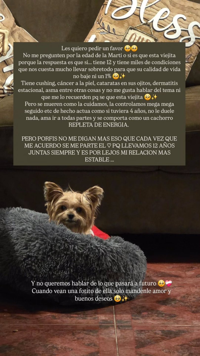 “Les quiero pedir un favor. No me pregunten por la edad de la Marti o si está viejita porque la respuesta es que sí… Tiene 12 y tiene miles de condiciones que nos cuesta mucho llevar sobretodo para que su calidad de vida no baje ni un 1%”, comenzó contando.
