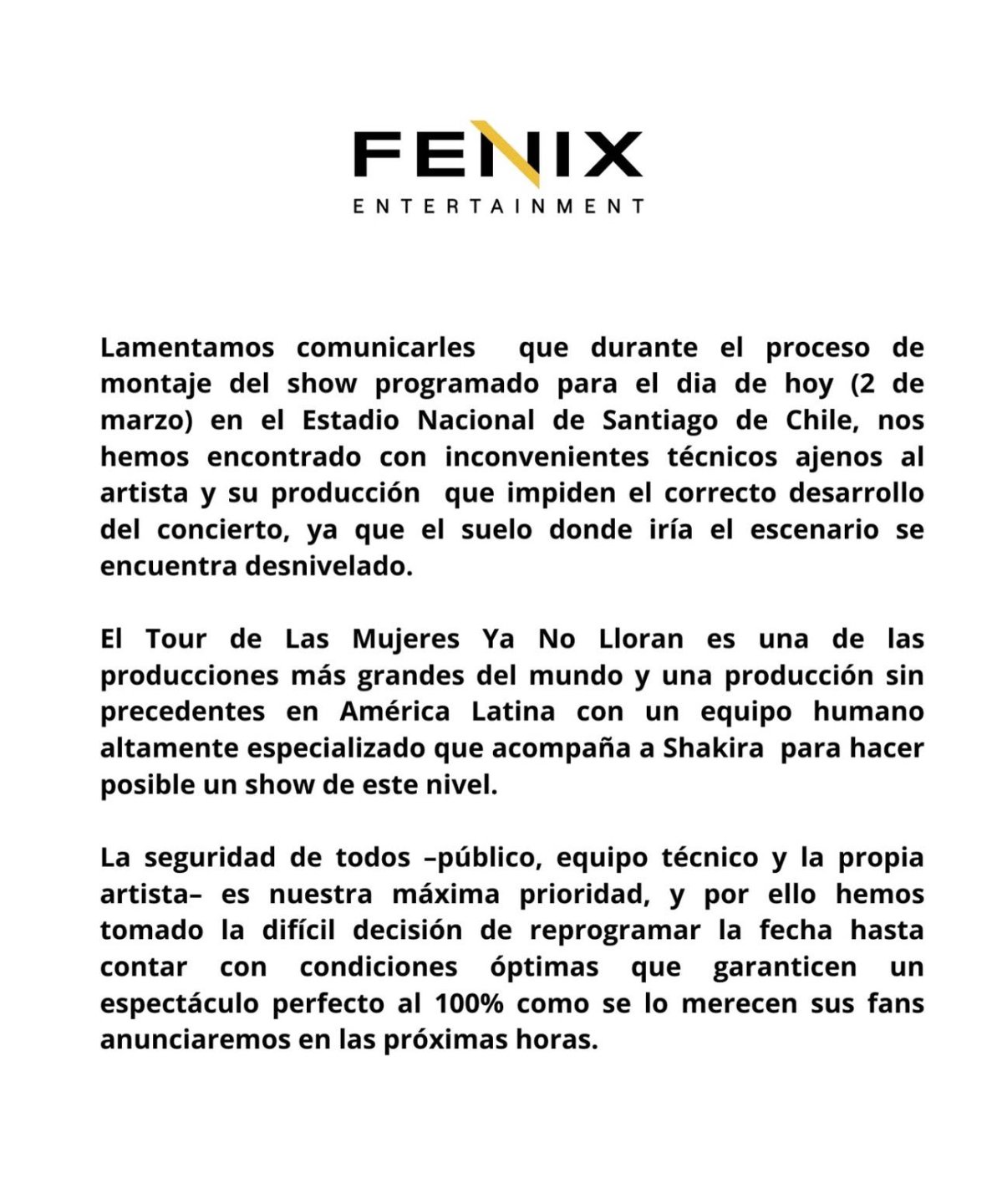 Desde la productora Fénix detallaron sus razones por las que el concierto de Shakira deberá ser reagendado.