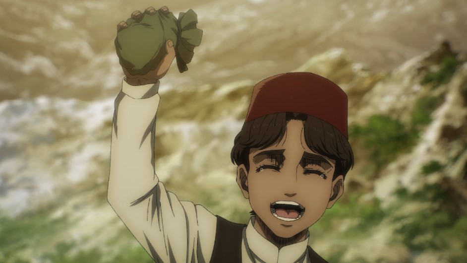 Finalmente, hizo su aparición tanto el refugiado del medio oriente como su familia y no sólo les comparten una bebida que pone felices a los eldianos, sino que hacen que Eren termine en lágrimas y angustiado al mirar su campamento: Según le explica a Mikasa, los refugiados y los eldianos han sufrido dolores similares.