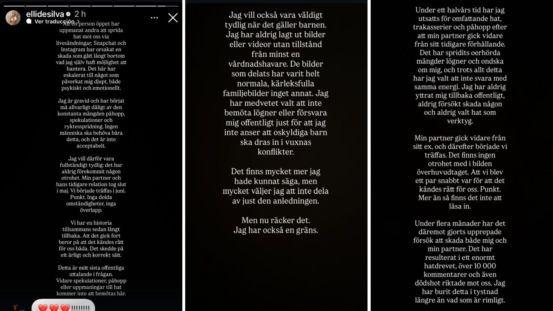 Además, aclaró que "están difundiendo afirmaciones y planes sobre mi hijo que no son ciertos", y publicó la historia de Ellinore junto a su hija, lo que provocó que un familiar de ella le llamara para pedir que eliminara la publicación, sin que de Silva eliminara a Gio de sus redes sociales.