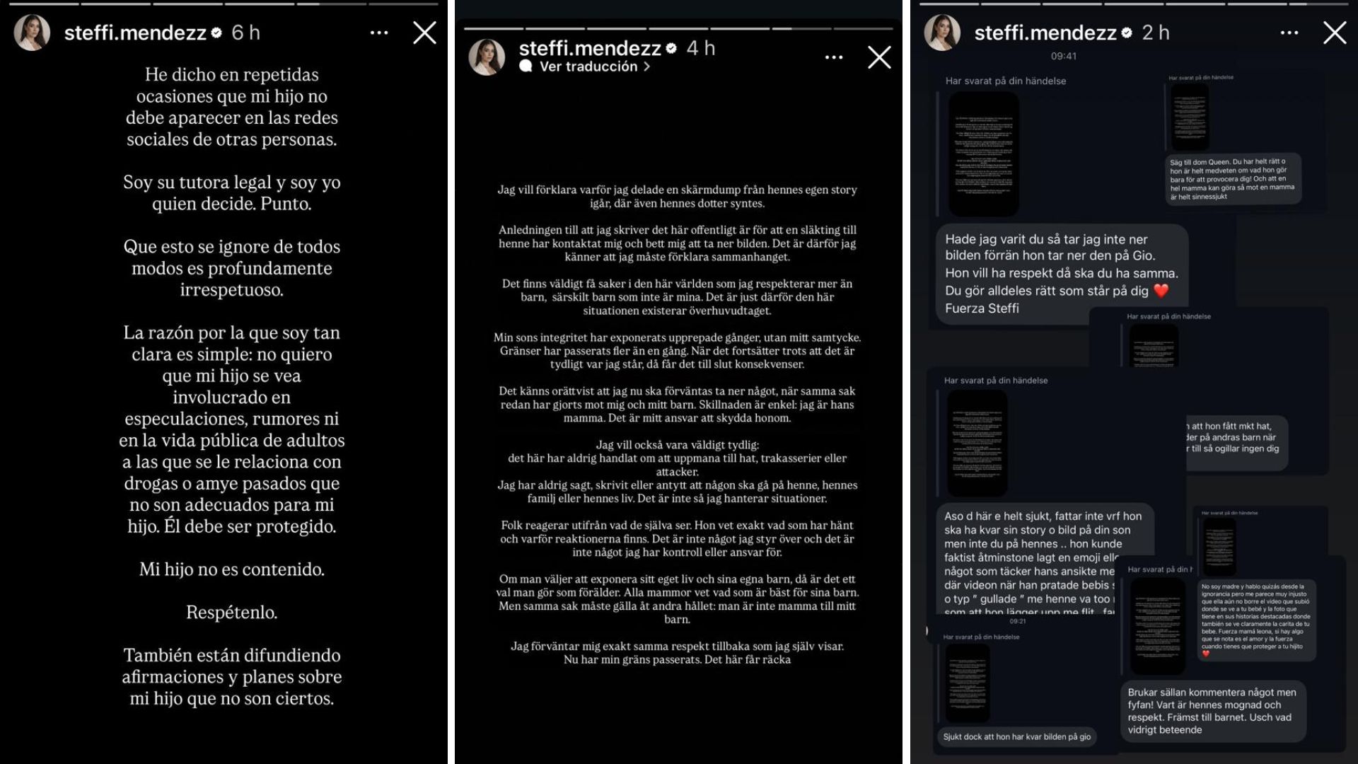 La situación enfureció a Steffi Méndez, quien declaró que el registro se publicó sin su consentimiento y precisó: "No quiero que mi hijo se vea involucrado en especulaciones, rumores, ni la vida pública de adultos a los que se les relaciona con drogas o amye pasados que no son adecuados".