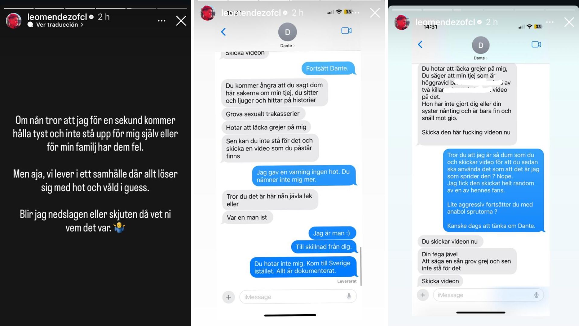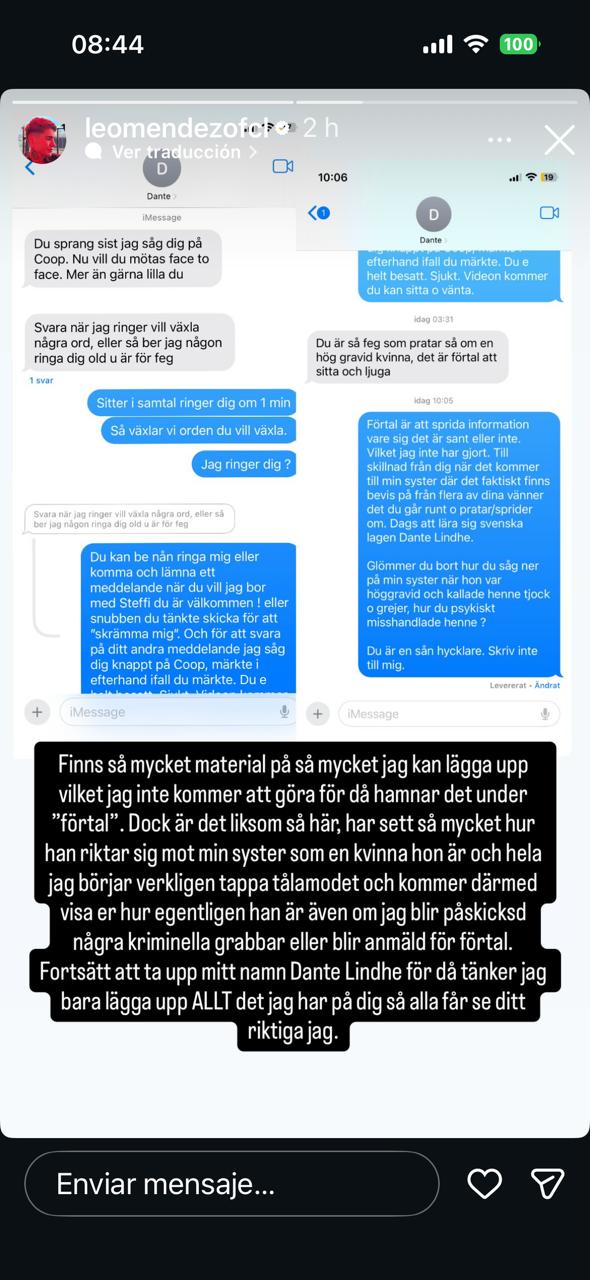 Leo Méndez Jr. expuso presuntas conversaciones con Dante Lindhe, donde el hijo de DJ Méndez lo acusa de difamar a su hermana y tener pruebas de ello: "¿Estás olvidando cómo menospreciabas a mi hermana cuando estaba muy embarazada y la llamabas gorda y cosas así? ¿Cómo abusabas mentalmente de ella? Eres tan hipócrita. No me escribas".