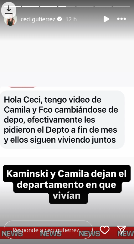 A través de su cuenta de Instagram, Gutiérrez compartió el mensaje de un seguidor que escribió: "Tengo video de Camila y Francisco cambiándose de departamento. Efectivamente, les pidieron el departamento a fin de mes y ellos siguen viviendo juntos".