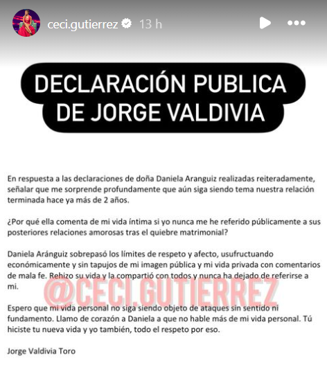 "Daniela Aránguiz sobrepasó todos los límites de respeto y afecto, usufructando económicamente y sin tapujos de mi imagen pública y mi vida privada con comentarios de mala fe", añadió.