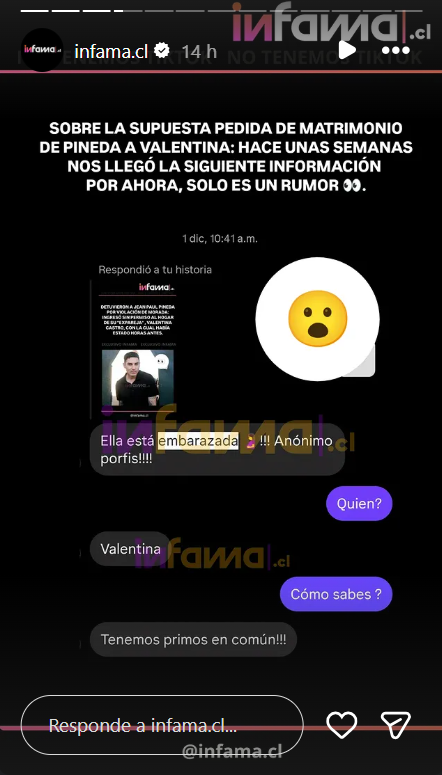 Finalmente, el portal Infama compartió una conversación con una fuente que aseguró tener primos en común con Valentina y reveló: "Ella está embarazada".