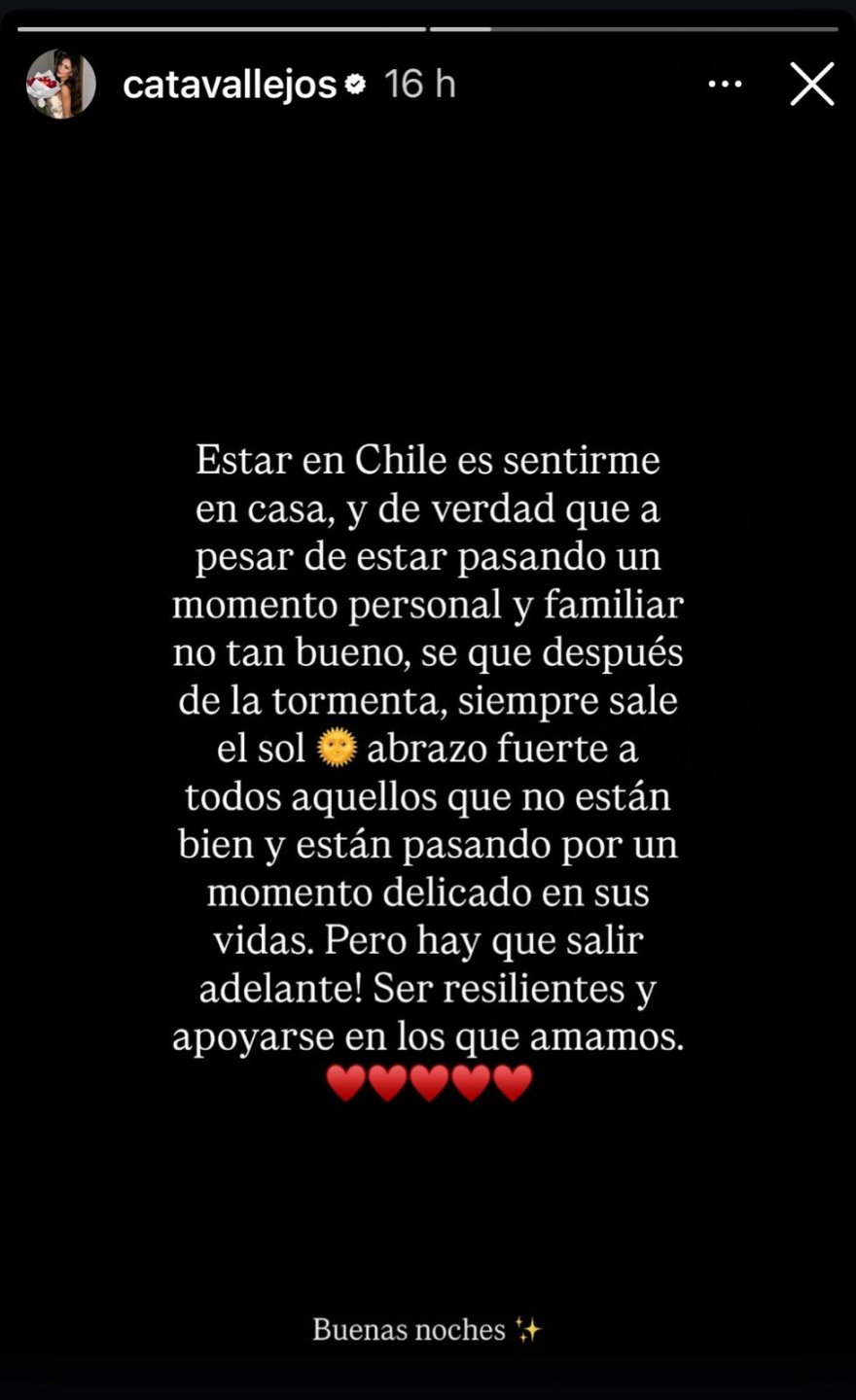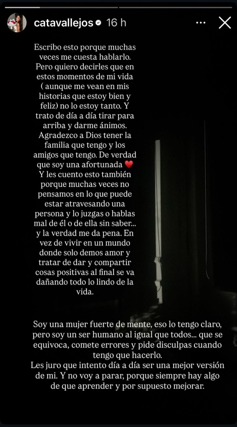 "Quiero decirles que en estos momentos de mi vida, aunque me vean en mis historias que estoy bien y feliz, no lo estoy tanto. Y trato de día a día tirar para arriba y darme ánimos", señaló Vallejos a través en su cuenta de Instagram.