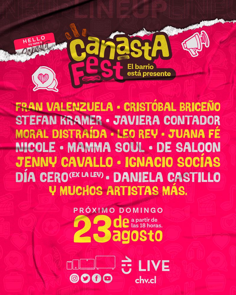 Lee también: Director de "Tengo miedo torero": "Está generando muchas expectativas por lo que significa Lemebel"A diferencia de otros festivales similares, "Canasta Fest" será una instancia inédita en la que se reunirán músicos de diferentes estilos, como Moral Distraída, Nicole, Cristóbal Briceño y Francisca Valenzuela, junto a comediantes destacados, como Javiera Contador, Ignacio Socías, Jenny Cavallo y Stefan Kramer, además de artistas provenientes de algunas de las 125 organizaciones barriales que son parte de Canasta Local en 11 regiones del país.
