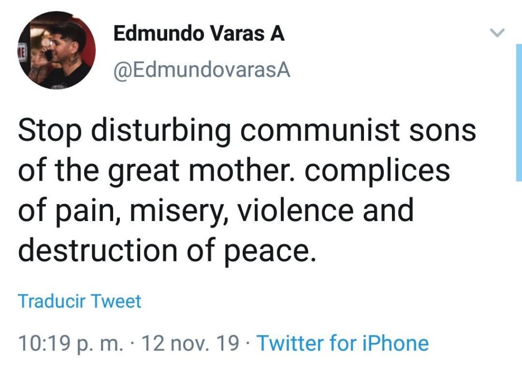 Pero lo más particular de su publicación, fue que la hizo en inglés. “Stop disturbing communist sons of the great mother. Complices of pain, misery, violence and destruction of peace”, escribió el ex chico reality, lo que traducido al español sería: “Paren los disturbios comunistas hijos de la gran madre. Cómplices del dolor, miseria, violencia y destrucción de la paz”.