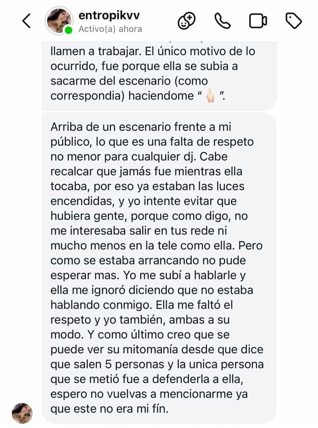 Entropika aseguró que todo esto fue "arriba de un escenario frente a mi público, lo que es una falta de respeto no menor para cualquier DJ".