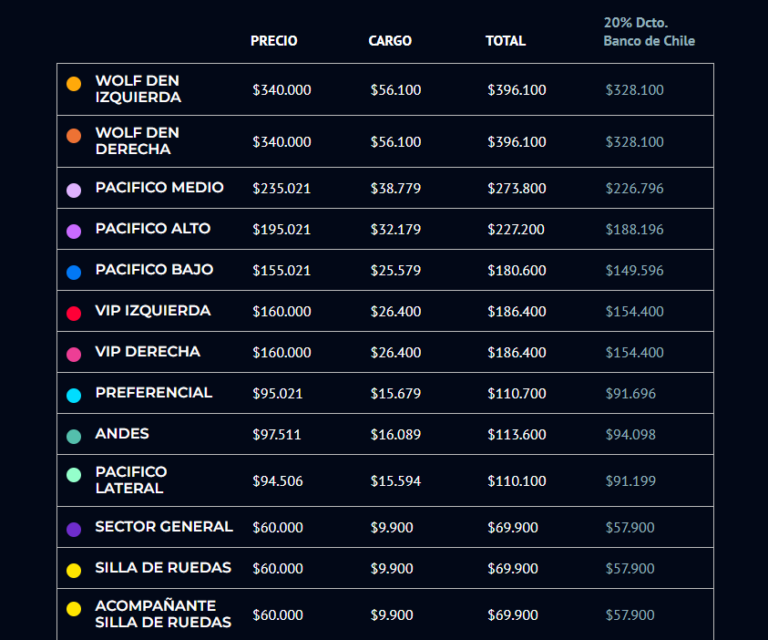 En cuanto a los precios, estos variaban dependiendo de la cercanía al escenario y en su mayoría eran superiores a los $100 mil pesos.