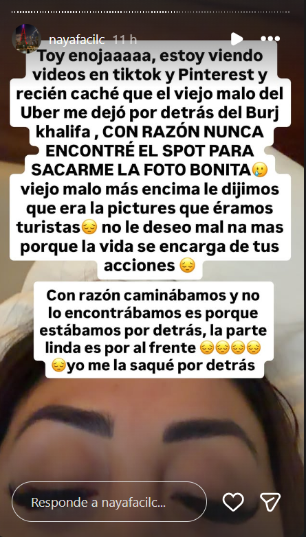 Sin embargo, la influencer intentó por todos los medios tomar su clásica fotografía principal durante la noche en el Burj Khalifa, pero se equivocó de ruta porque no sacó una licencia internacional, por lo que se desplazó en Uber y el conductor la dejó en otro punto.
