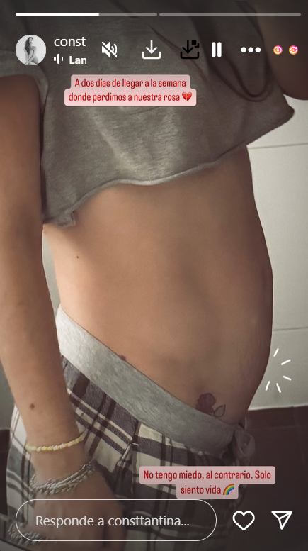 "A dos días de llegar a la semana donde perdimos a nuestra Rosa", escribió Tanza en su historia de Instagram, mientras mostraba su abultado vientre.