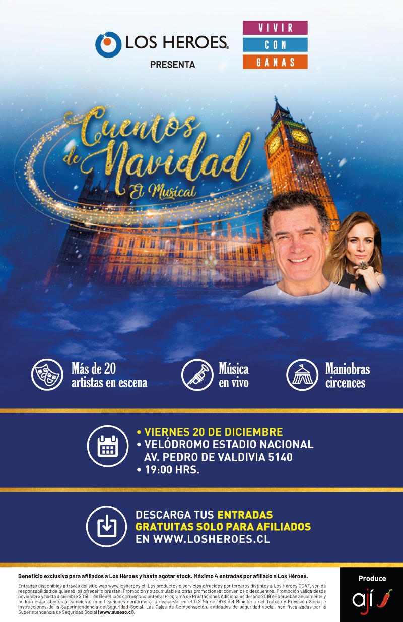 Por tercer año consecutivo, la Caja de Compensación Los Héroes presentará la obra “Cuentos de Navidad, el musical” en La Serena, Viña del Mar, Concepción y Santiago. Acá te contamos cómo obtener entradas.